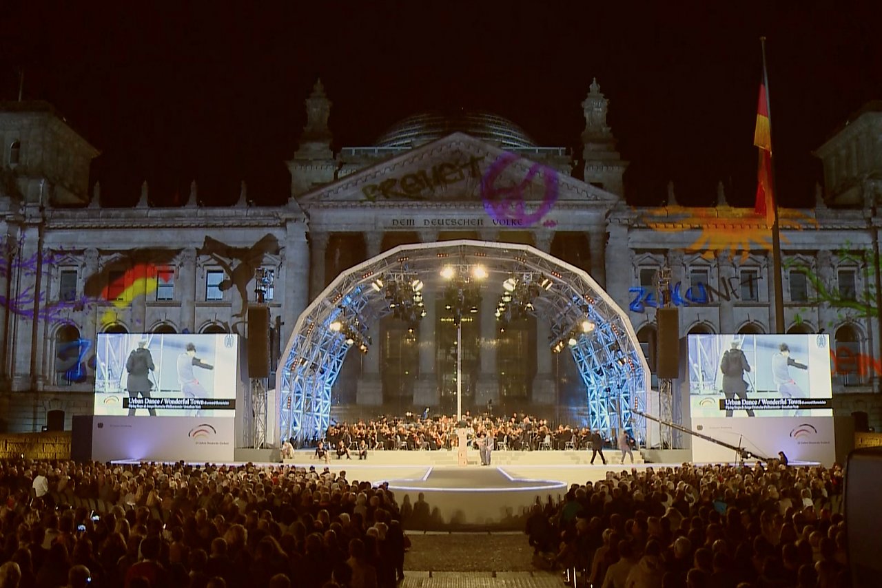 Im Rahmen des Festaktes zum 3. Oktober performten die Flying Steps parallel in zwei Städten. In Berlin begeisterten sie nicht nur die deutsche Führungsspitze, sondern waren auch die Ersten, deren Logo auf den Reichstag projiziert wurde.